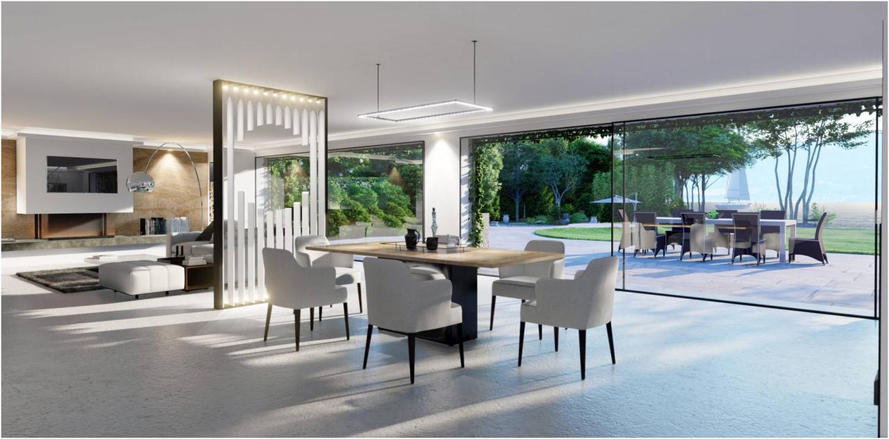 Les espaces sont ouverts vers l'extérieur et la maison est plongeante sur le lac et les montagnes.